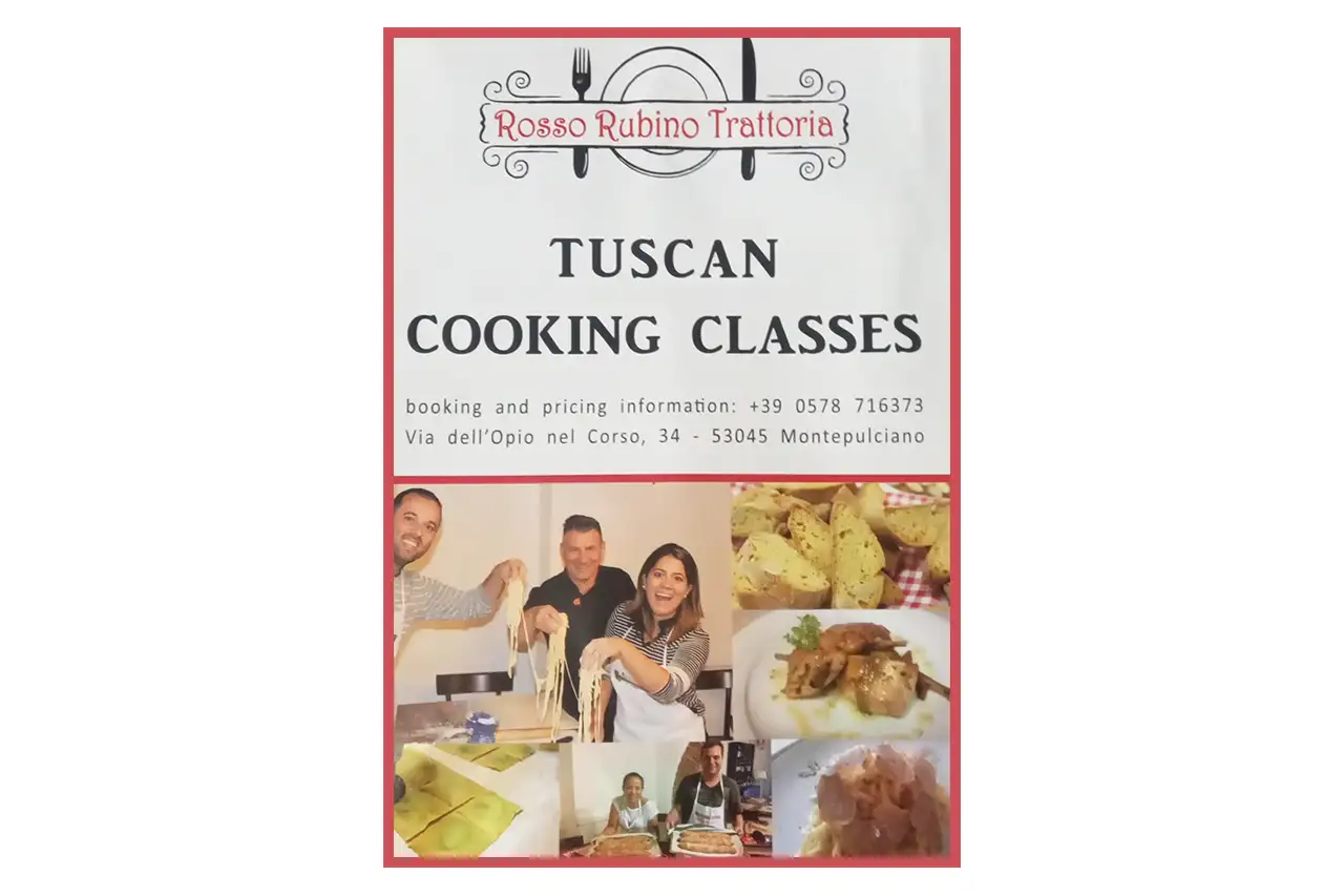 In collaborazione con i nostri amici della Trattoria Rosso Rubino di Montepulciano, scopri i sapori autentici della tradizione toscana con un corso pratico e coinvolgente. Imparerai a preparare piatti tipici come la pasta fatta in casa, utilizzando ingredienti locali e stagionali. Un’occasione per vivere un’esperienza conviviale, approfondire la cultura culinaria della nostra regione e portare a casa nuove ricette da condividere con famiglia e amici.